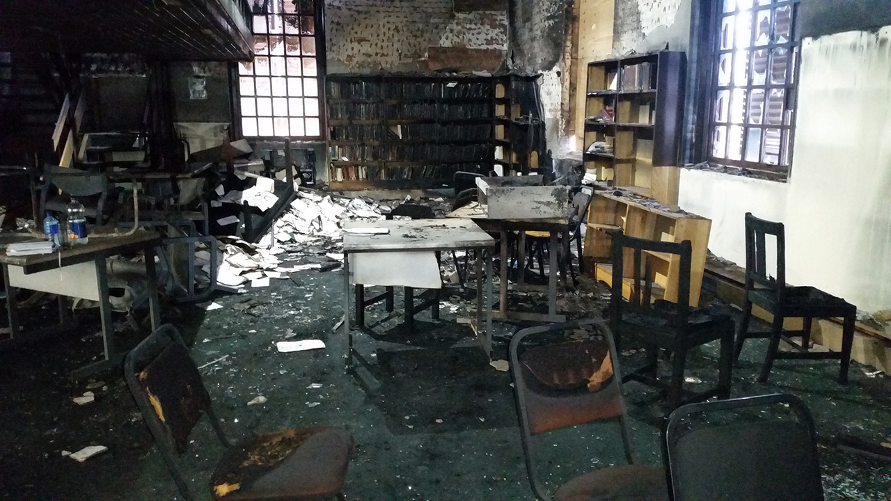In 2016, there were masses protesting in a fight for the Fees Must Fall movement. Unfortunately one of these protesters turned to violence and destruction of property. This led to a Law Library being petrol bombed in the attempt to burn it down. Although an entire corner of the library was burnt beyond recognition, the rest of the library however was smoke and soot damaged.